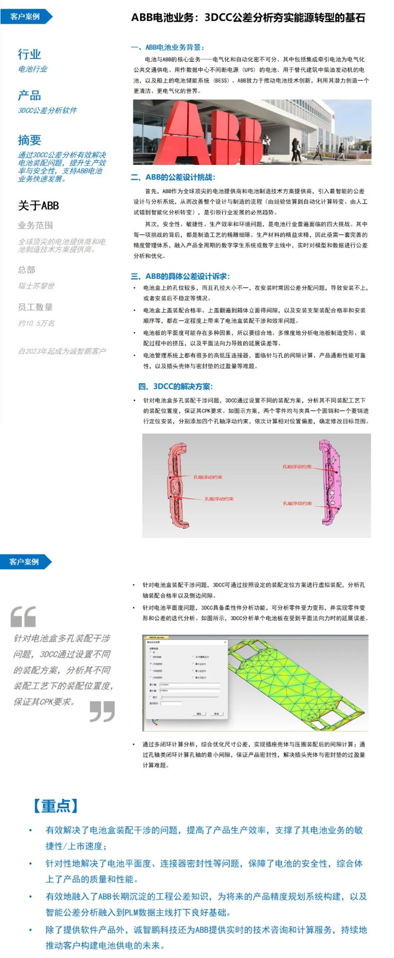 在ABB全球电池业务的实际应用中,3DCC软件帮助客户从以经验估算为主的人工试错流程,迈向基于数据驱动和虚拟装配的智能化公差分析体系,显著提升了其电池产品的设计精准性与制造效率。面对电池盒多孔装配干涉、电池平面度误差、连接器密封可靠性等一系列影响产品质量与装配效率的关键技术难题,3DCC通过柔性件仿真、多闭环公差链计算和虚拟装配分析等功能,为ABB提供了覆盖全流程的系统化解决方案。