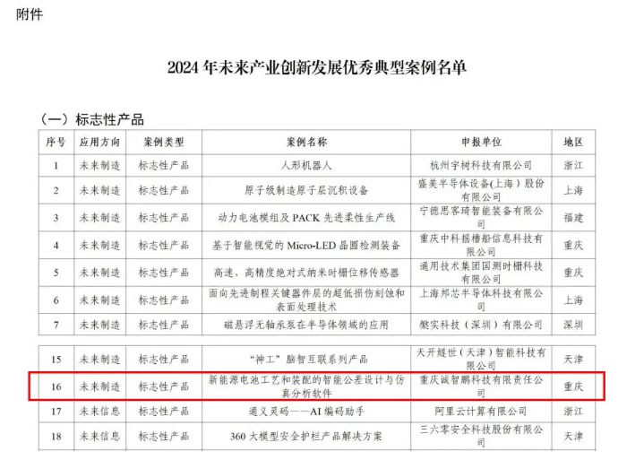 近日,工业和信息化部高新技术司公布了《2024年未来产业创新发展优秀典型案例》公示名单,诚智鹏自主研发的“新能源电池工艺和装配的智能公差设计与仿真分析软件”成功入选“未来制造”方向标志性产品类优秀案例,成为全国同类领域的典型代表。